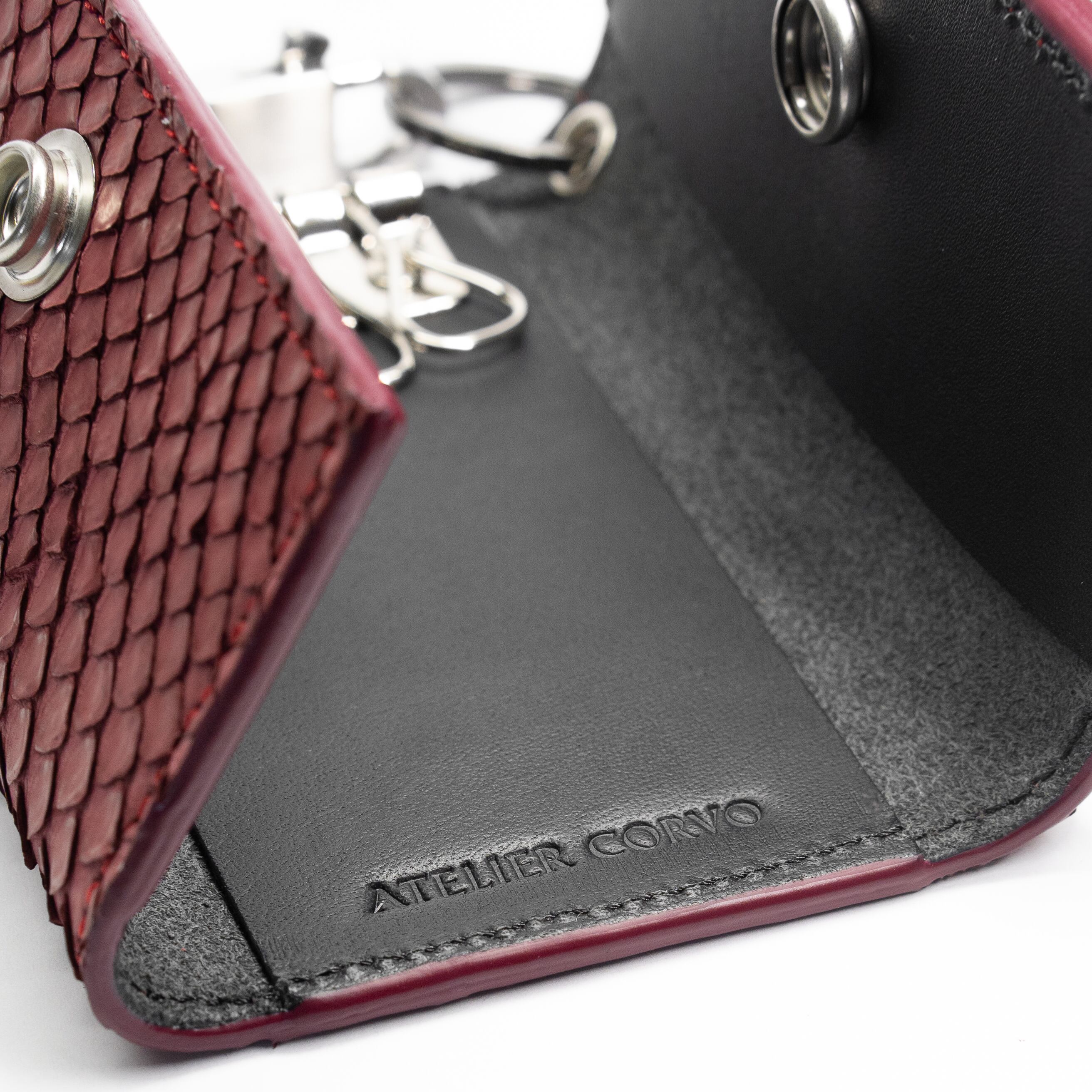 三つ折りタイプのキーケースは5連のキーフックだけでなく、キーリングも採用。内に付いたスリットポケットにカードやお札を収納すれば、ミニマルなお財布としても活躍。シンプルなデザインながらも、蛇革を使用したことで無骨な印象を与えてくれます。